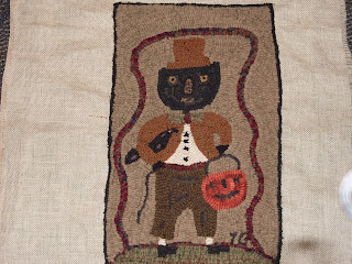 Some months ago I helped my friend Traci put Mr. Iggy on a piece of burlap so that she could get hooking. She has finished the piece and he is cute .